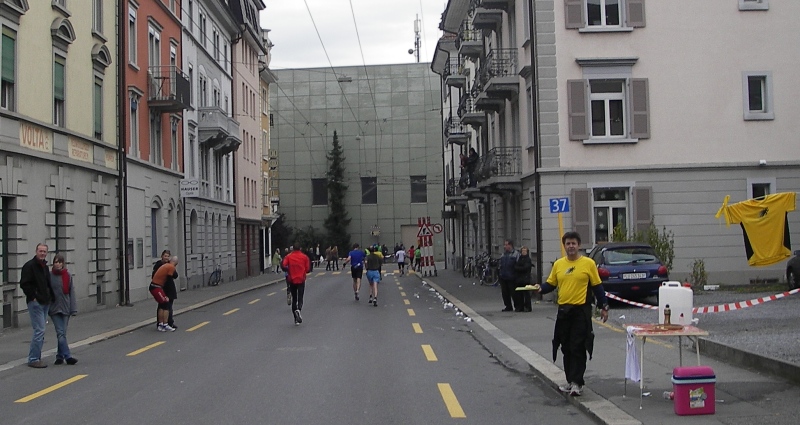 Auf der Stutzstrasse der wichtigste Hinweis auf Marathonregel 1 : Langsam (zu Beginn nicht überpacen), jetzt in der zweiten Runde eher nicht das Problem. Ich muss lächeln, denn ein Hopp, Lauf, das die Zuschauer zurufen kommt mir nun eher gelegen. Aber dennoch solche Anekdoten bieten sich eben nur dem, der langsam läuft und auch mal seine Umwelt wahrnimmt. |