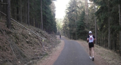Nach dem Wendepunkt geht auf dem Rückweg leicht bergan, dann wieder vorbei an der Kovohute und den wartenden Fans. Wie die meisten Fans so mache auch ich hier noch ein Foto und denke, bis bald in ca. 4Stunden, dann sehen wir uns an gleicher Stelle wieder. Auch meine Frau macht noch ein Erinnerungsbild, nach dem Motto: So fit sahst du mal aus. | |
