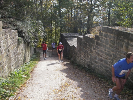 kurzen Lauf durch die Stadt geht es in den Wald, wo erste Bodenwellen auf den Lauf einstimmen .