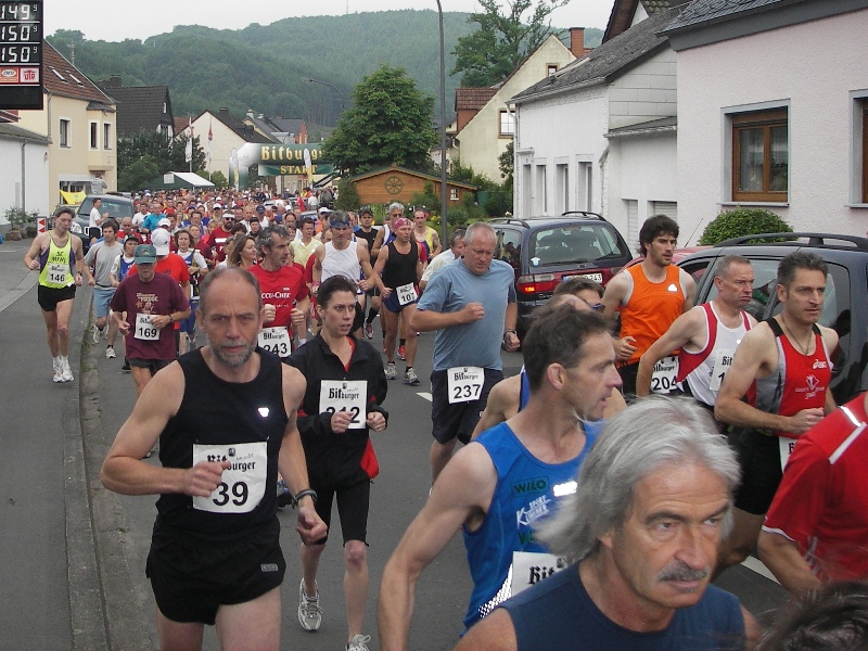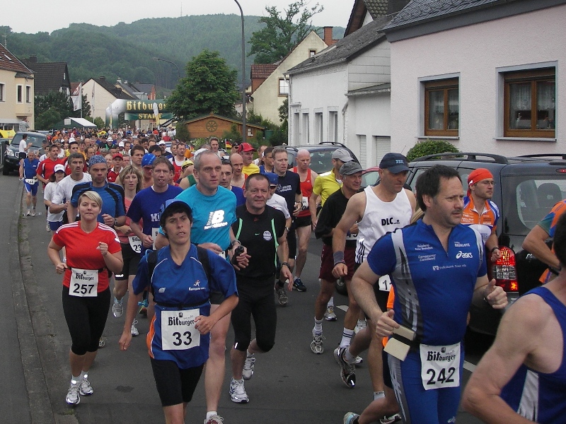 Unter den 170 Marathonstartern ist es leicht bekannte Gesichter wiederzufinden. Ich treffe sogar Freunde aus der Pfalz wieder. Hans- Jürgen Korz (88) und Rainer Sarter (130) von der LLG Drei Buchen haben sich auf den Weg von der Pfalz in die Eifel gemacht, um gemeinsam diesen Landschaftsmarathon zu genießen. |