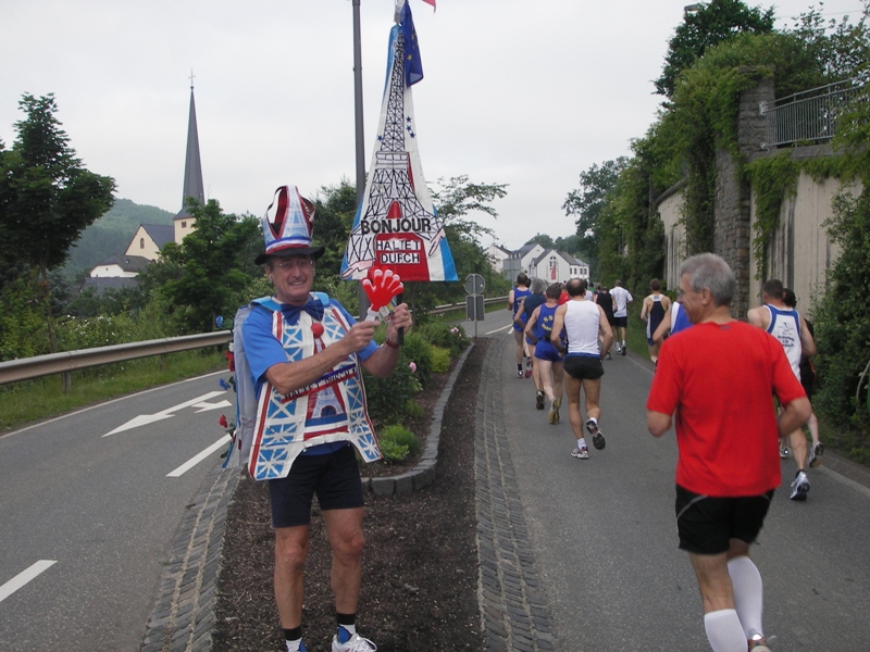 Einige Zuschauer feuern uns an und natürlich die Marathonikone Michele, der diesmal nicht mitläuft, aber viermal an der Strecke für Stimmung sorgt. |