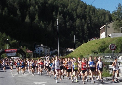 Für manch einen war der Start doch zu früh, denn Helmut Schiessl (Nr5), amtierender Berglaufweltmeister auf der Langdistanz und letztes Jahr auf Platz 3, muss dem Feld sogar nachlaufen, was ihn aber an seinem späteren Rennsieg nicht hindern konnte. Wenigstens konnte er danach sagen er hätte alle Gegner überholt |