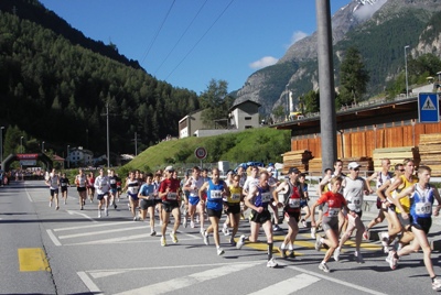 In St. Niklaus angekommen ergießt sich ein großer Läufertross auf den kurzen Weg zur Kleiderabgabe. Der Ort scheint aus allen Nähten platzen zu wollen. |