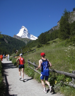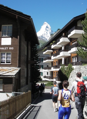 Die Halbmarathonmarke ist passiert und nach einem kleinen Schlenker durch Zermatt immer das Matterhorn vor Augen, gibt es nach einer kleinen sandigen Steigung die Wende und den einzigen kurzen Begegnungsverkehr, dann ein paar mal rechts und links und schon geht es steil berauf aus Zermatt heraus. |